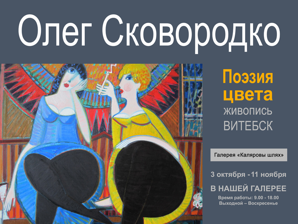 3 октября в 17.00 в галерее «Каляровы шлях» состоится открытие персональной выставки работ Олега Сковородко, члена Союза художников Республики Беларусь. Экспозиция «Поэзия цвета» включает более 20 живописных натюрмортов, пейзажей, портретов, сюжетных композиций.