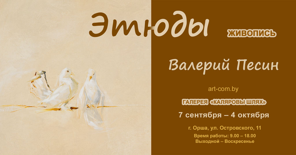 7 сентября в 16.00 в галерее «Каляровы шлях» (Орша) откроется выставка известного и хорошо узнаваемого художника Валерия Песина (Минск) под названием "Этюды". На протяжении многих лет работы автора экспонируются в известных московских и европейских галереях, музеях Беларуси, а также в частных собраниях крупнейших коллекционеров Беларуси, России и Западной Европы.Творческая биография Валерия Песина неординарна и насыщена интересными фактами. Начинал Валерий в среде легендарного авангарда Беларуси 1980 – 1990-х гг. (сообщество «БЛО»). Также, в 80-х вошёл в круг московских и ленинградских художников-нонконформистов и коллекционеров. Он проделал достаточно большой и сложный путь, чтобы понять, что его предназначение – стать художником. По признанию самого мастера, его творческая деятельность – это некое «поручение» свыше. Быть художником для него – это духовная, сродни жизненной необходимости, потребность, а не профессия. В какой-то степени занятие искусством для Валерия Песина – это поиск. Поиск ответов на вопросы, возникающие каждый день, поиск себя как человека и творца, понимание себя в этом мире.